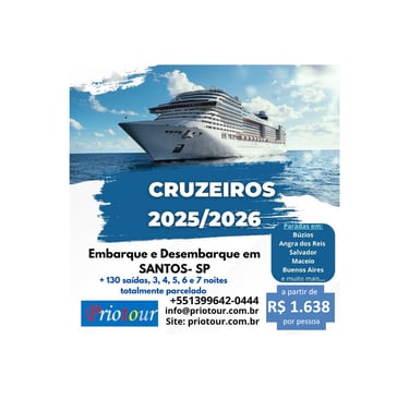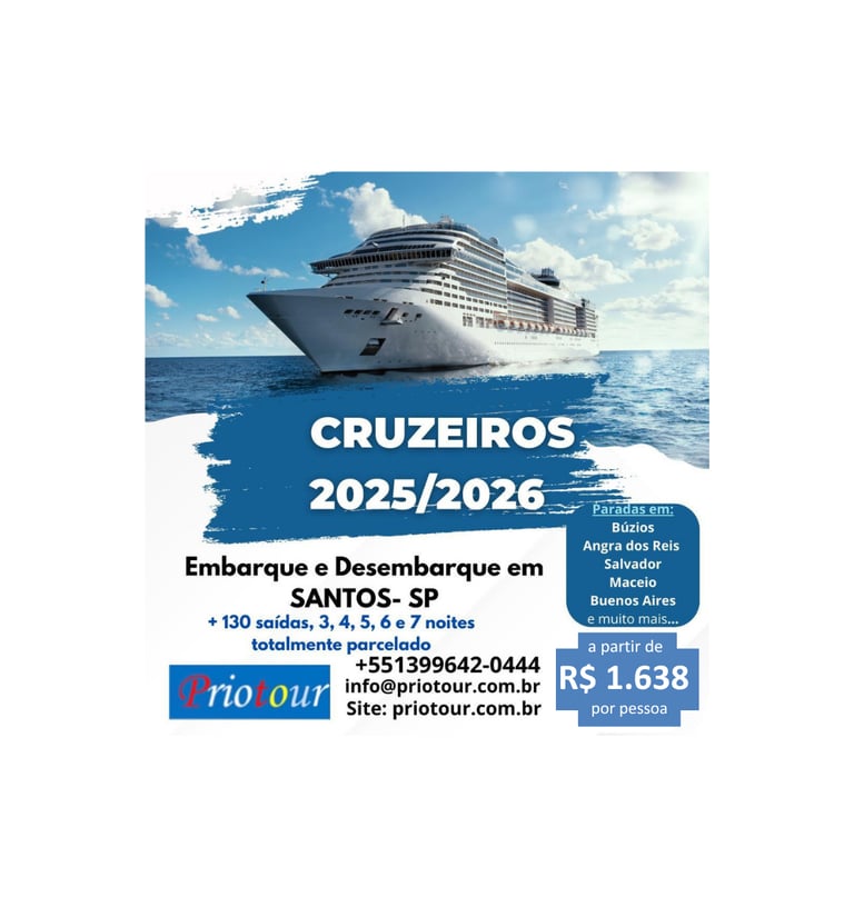 COSTA FAVOLOSA: 3 Noites. Embarque e Desembarque em SANTOS. Paradas em Balneário Camboriú, Porto Belo. A partir de R$ 1.838- por pessoa. Atualizado 06/01/2025 Consultar.