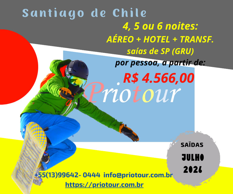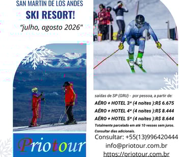 SANTIAGO DE CHILE ESQUI NEVE MONTANHA- 4, 5 ou 6 NOITES-
