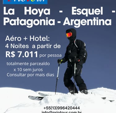 Os destinos da Patagonia Argentina oferecem uma experiência completa na neve, com difrentes oferta de ski/snowboar, montanha, atividades para todas as idades, lugares paradisíacos, com paisagens incríveis que convidam a relaxar e saborear a variada arte culinária típica dos restaurantes da patagonia, alem da hospitalidade com que os são recebidos os visitantes nos hotéis e cabanas de hospedagens.